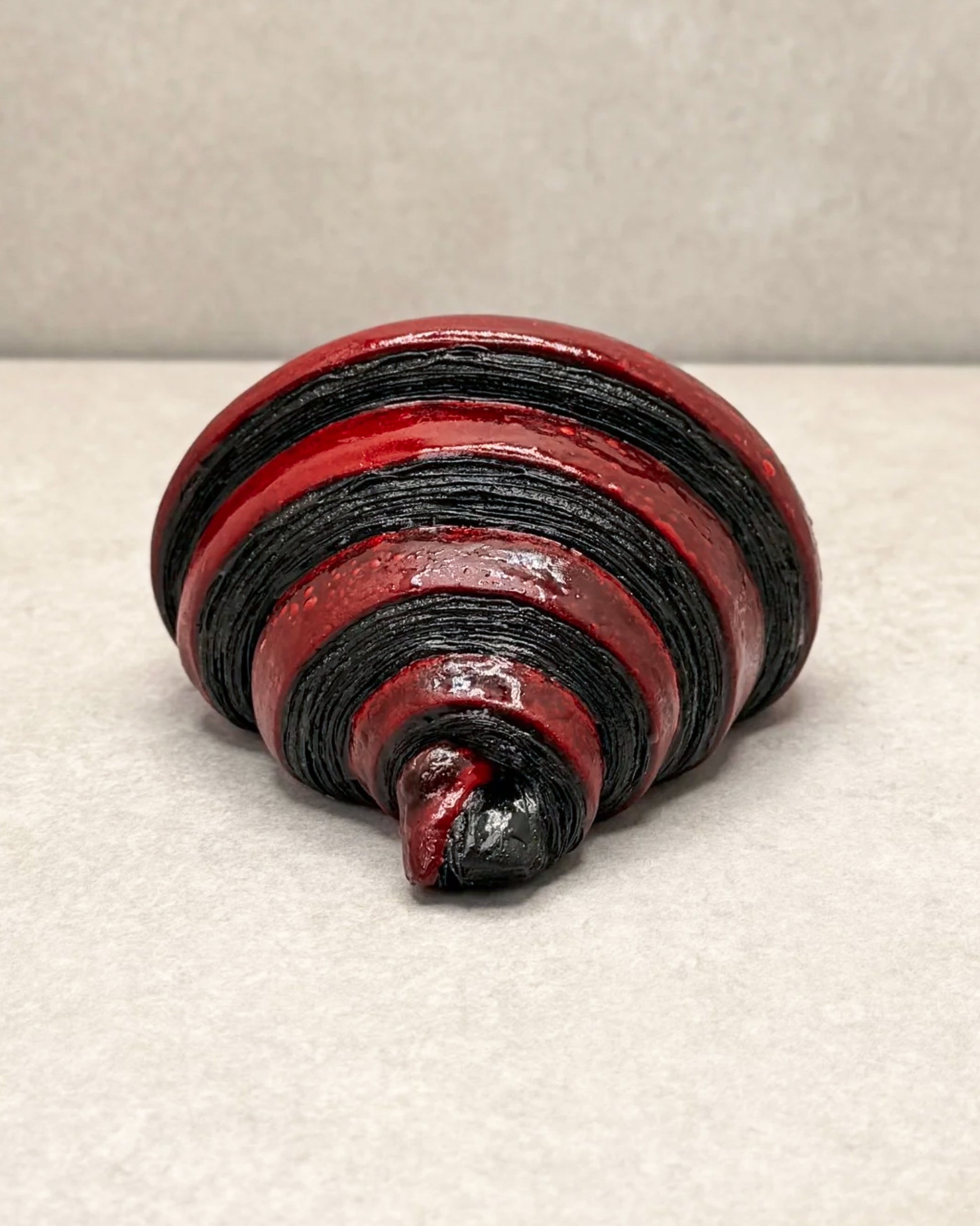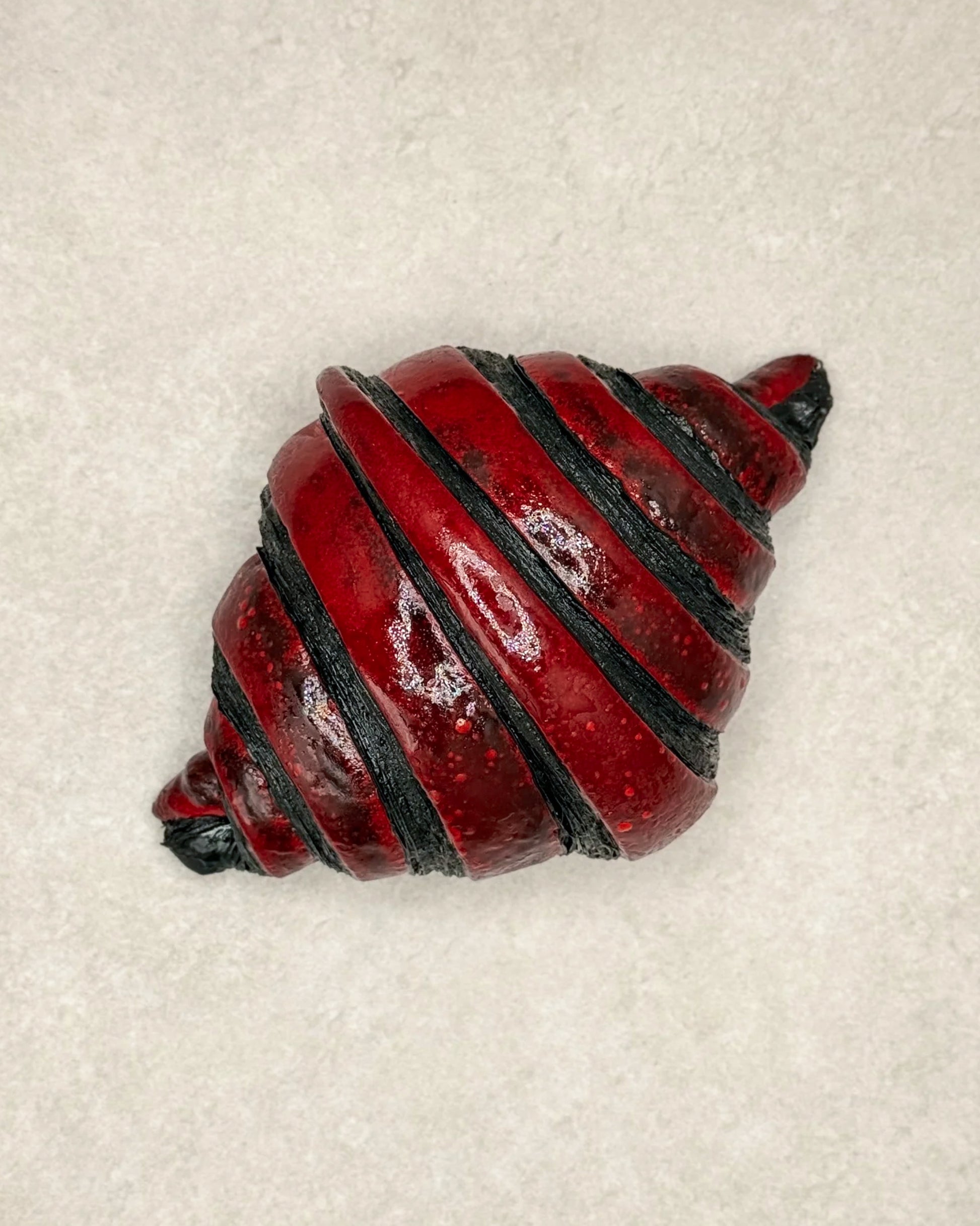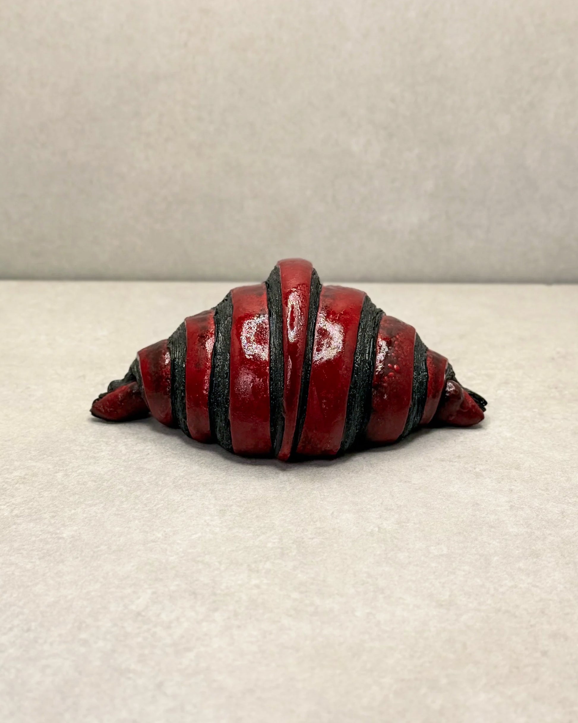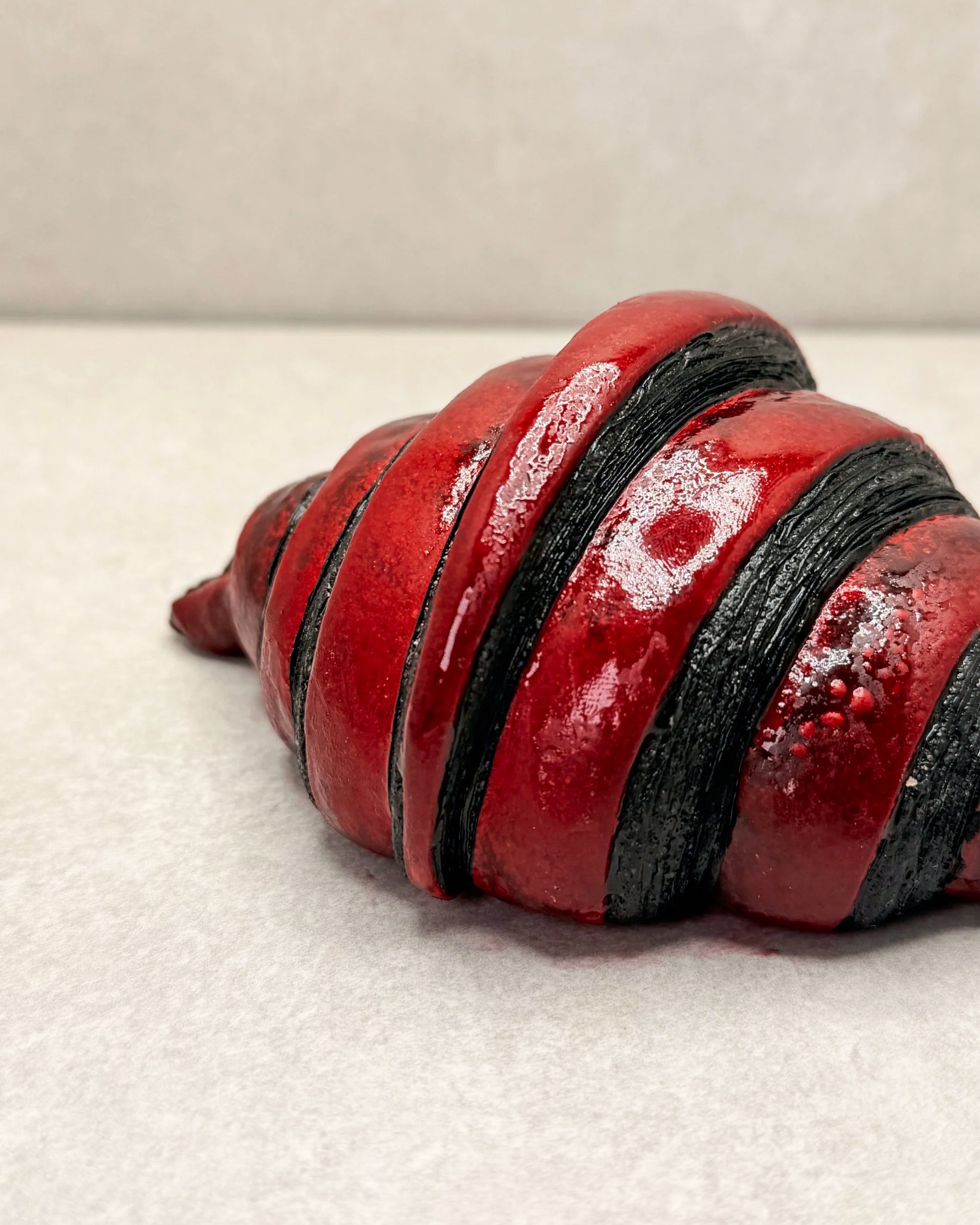 Croissant au charbon végétal actif, recouvert d’une fine couche rouge rappelant son cœur à la crème de framboise.