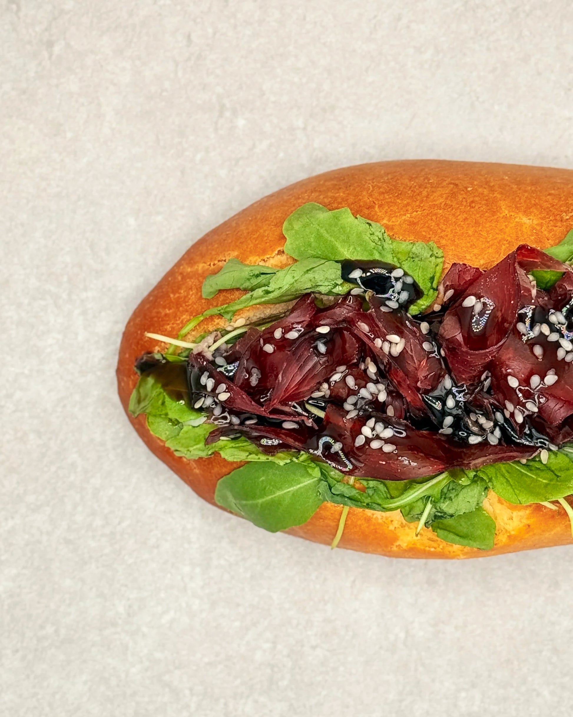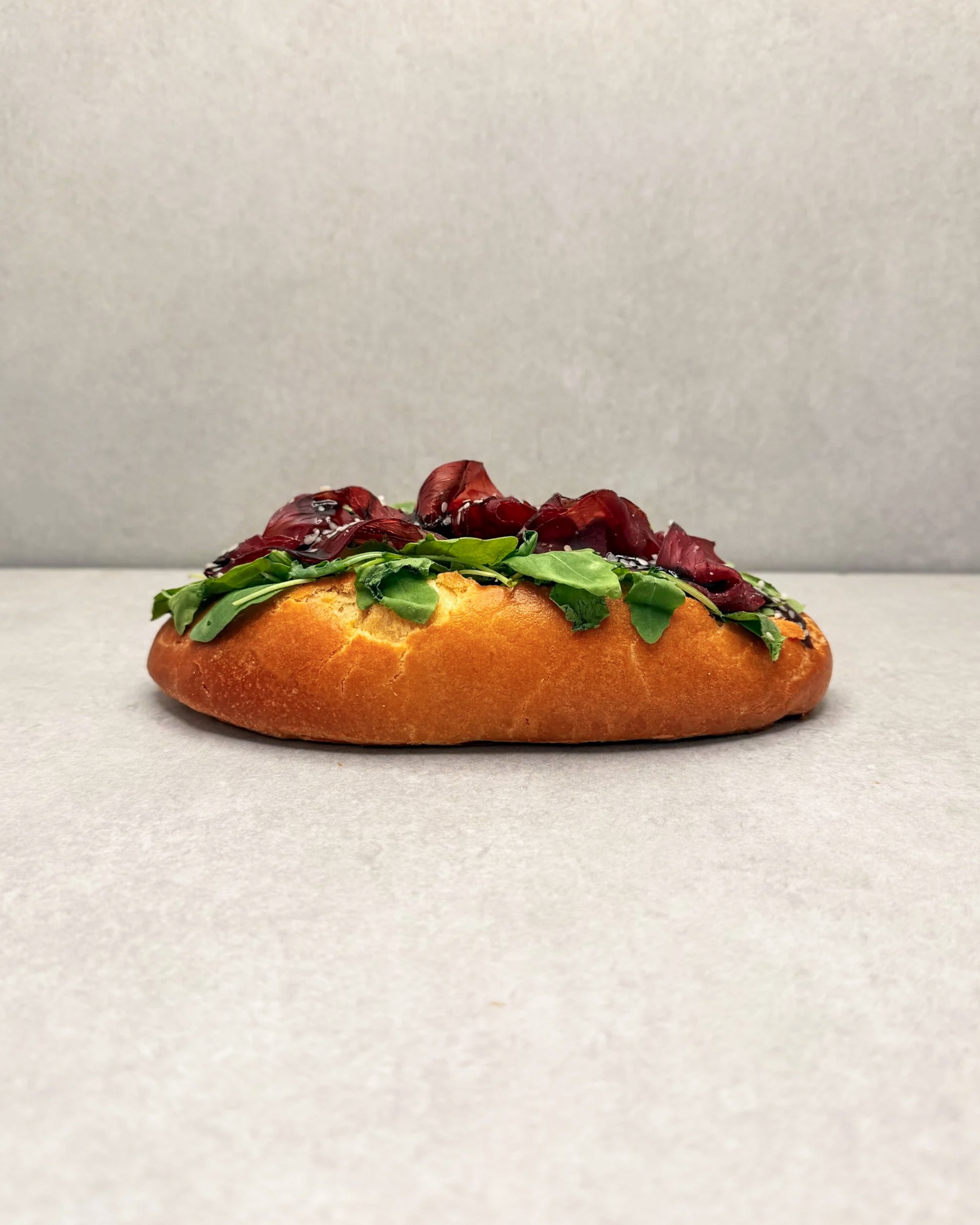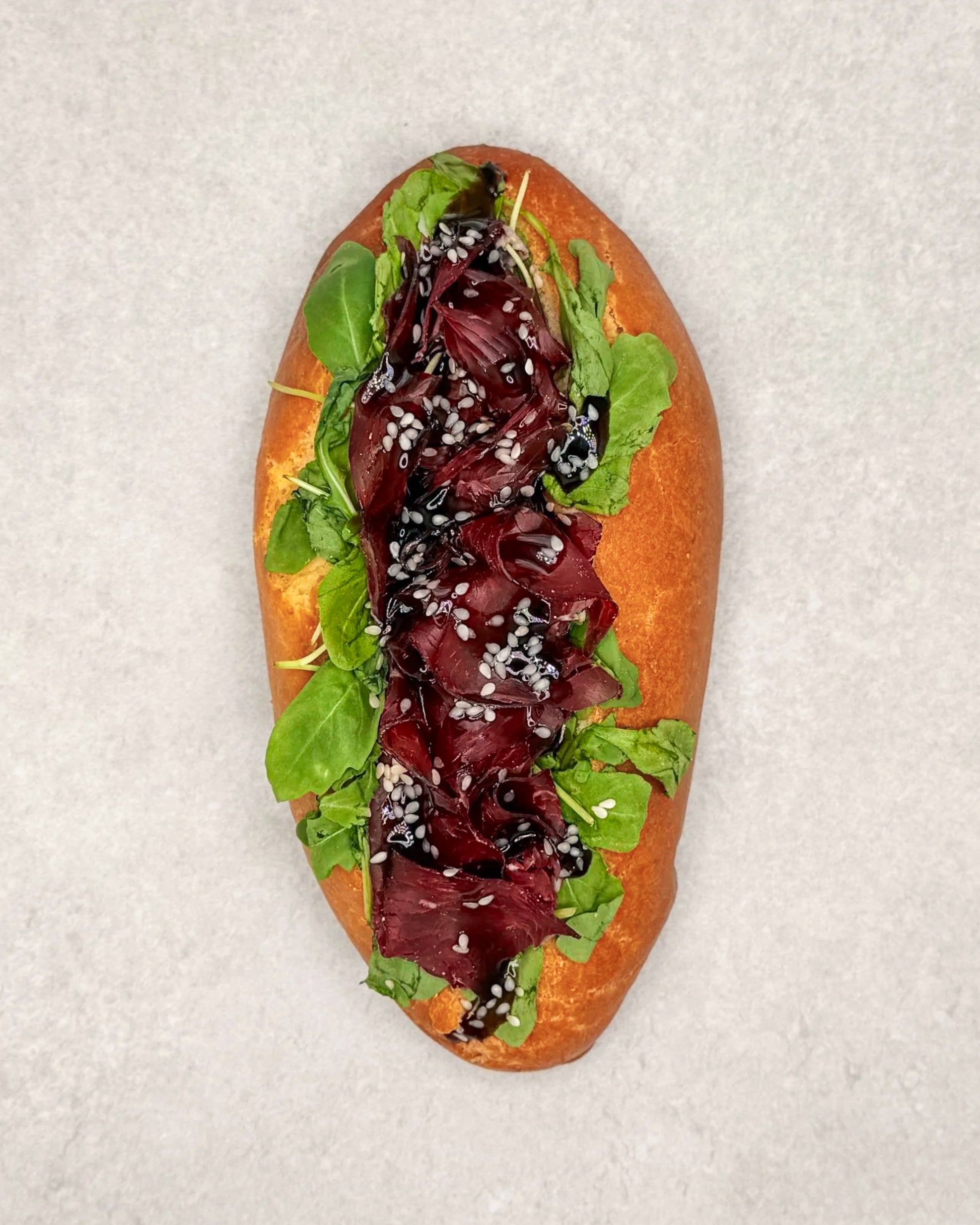 Brioche garnie de salade et de bresaola, surmontée d’une crème balsamique et parsemée de sésame blanc.